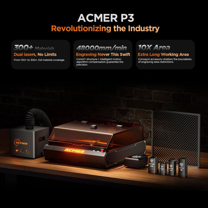 The maximum engraving size for the ACMER P3 depends on the laser modules and the presence of a conveyor. With a 24W diode laser or 2W IR laser, the maximum engraving size is 400mm x 400mm. For models with a 48W diode laser or dual-laser, the maximum engraving size is 400mm x 390mm. However, if the machine is equipped with our optional conveyor, the engraving size can be expanded to a maximum length of 4000mm, allowing you to engrave larger objects or continuous designs.