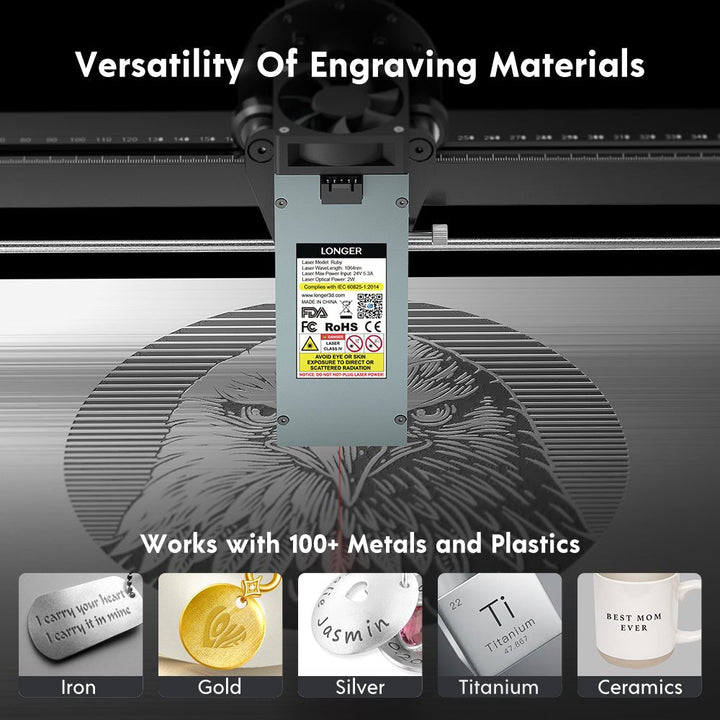 2. Versatility in Materials: Longer Ruby Laser Module boasts unmatched engraving prowess. From metals and alloys like iron, copper, aluminum, magnesium, zinc, gold, silver, and titanium to other materials like metal oxides, electroplated surfaces, ABS, inks, and epoxy resins,leather engravings, ceramic designs, and stone craftsmanship. Longer Ruby has got it all covered, no matter your needs.