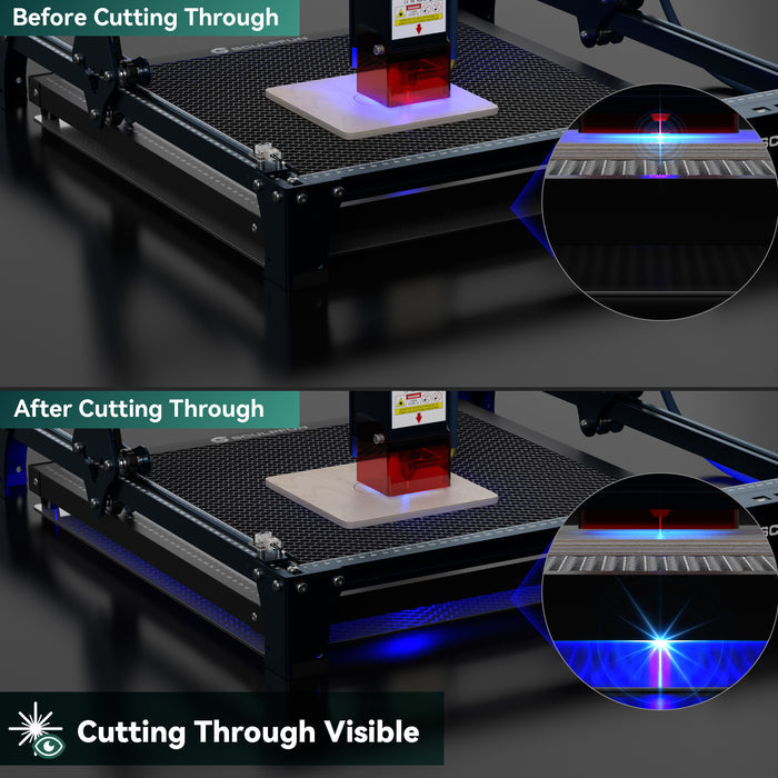 4. Observable design for cutting through: SCULPFUN honeycomb panel has a very convenient cutting observation design. When the laser cuts through the wood or acrylic, the metal backing plate at the bottom of the honeycomb panel will emit bright light, which means that the cutting has penetrated. It solves the problem that it is difficult for ordinary engraving machines to judge whether to cut through.