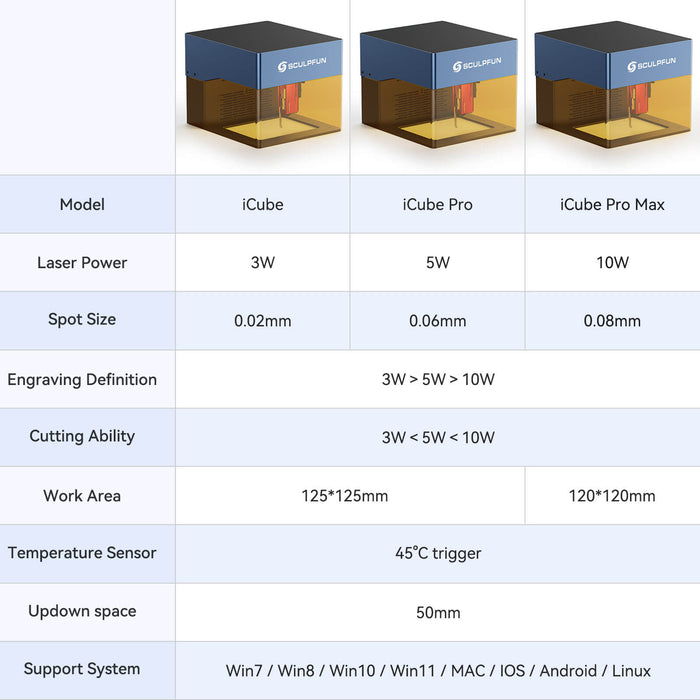 Ultra-fine Laser | iCube uses the 3W diode laser with 0.02mm ultra fine laser focus. It has super fine engraving ability which can present delicate engraving image. This laser engraver is suitable for engraving detailed objects and can cut colored paper and create three-dimensional paper works. | iCube Pro uses the 5W diode laser with 0.06mm ultra fine laser focus. It has strong cutting penetration and engraving precision, which can cut up to 10mm soft board, 6mm Acrylic, and engrave ceramic, stainless steel as well as some fine patterns like QR code, bar code. The engraving pattern has high pixels and smooth and delicate surfaces. | The iCube Pro Max uses 10W diode laser with 0.08mm laser focus. It has stronger laser performance, cutting penetration and higher working efficiency, which can engrave or cut more difficult materials and complete the laser tasks faster. |