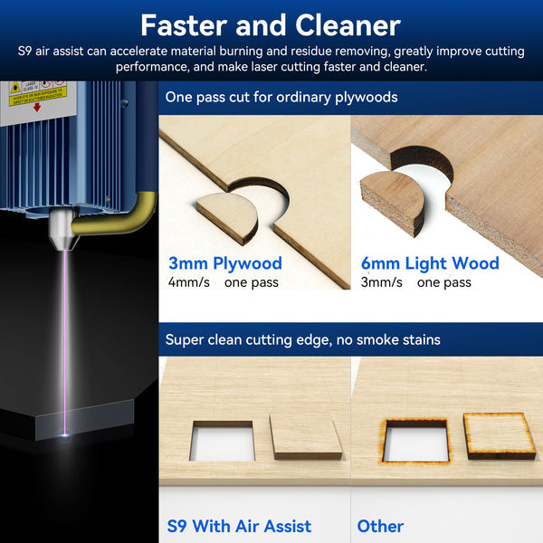 3. Faster and cleaner cutting: S9 air assist will greatly improve the cutting ability of the S9 laser. With air assist S9 cuts plywood and MDF boards 2-3 times faster, and cutting surfaces are cleaner and no smoky.