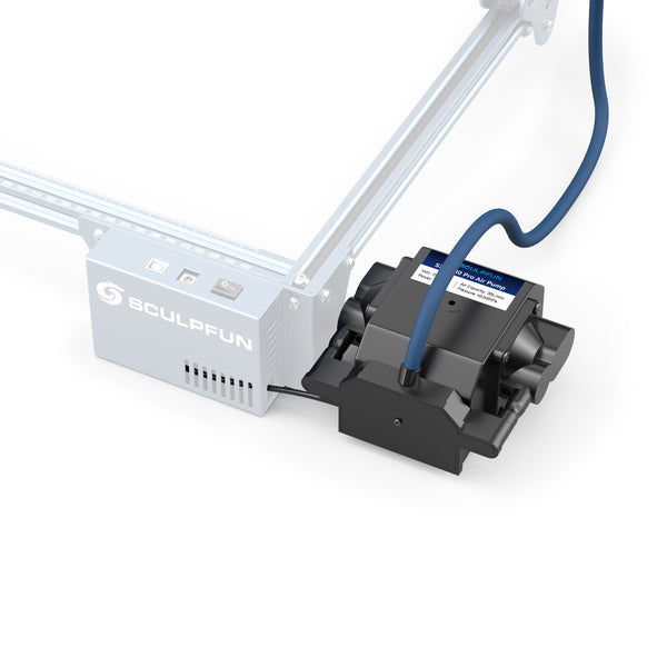 It is a 12V DC air pump, and the airflow of this Sculpfun air assist is 30L/min, controlled on and off directly from the motherboard. The air pressure output is stable and the sturdy design makes it very durable.