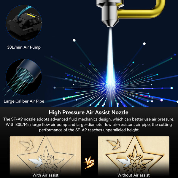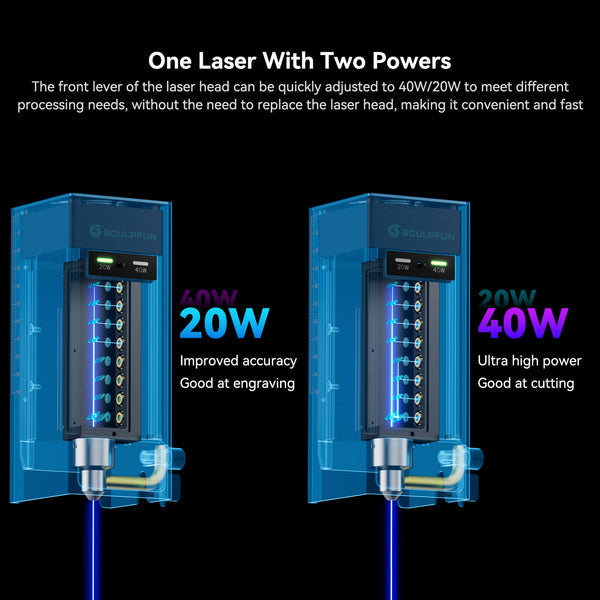 1. 40W Powerful Laser: Sculpfun SF-A9 adopts the 40W laser head with a strong cutting ability, and supports the 40W/20W laser power switching, which can cut 20mm plywood and 6mm dark acrylic at one pass time. It uses the heat pipe radiator to provide a faster and more balanced heat dissipation performance.